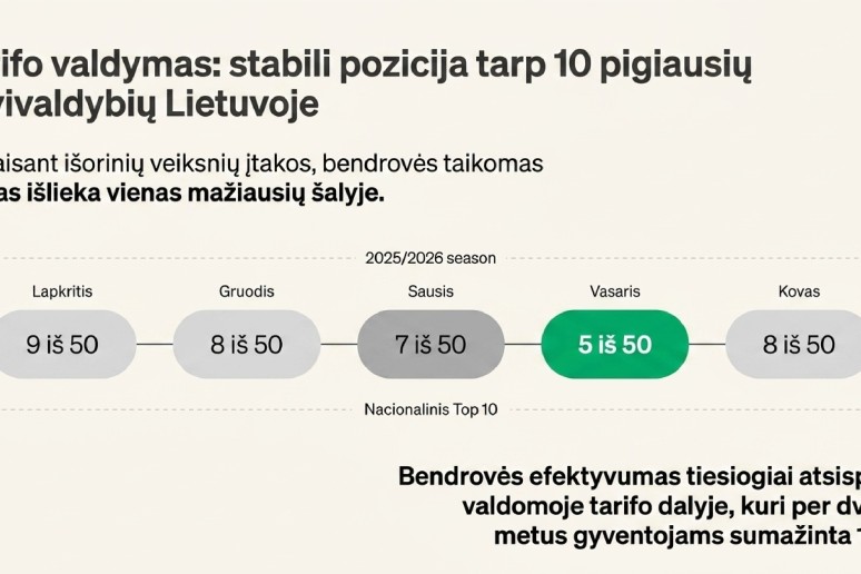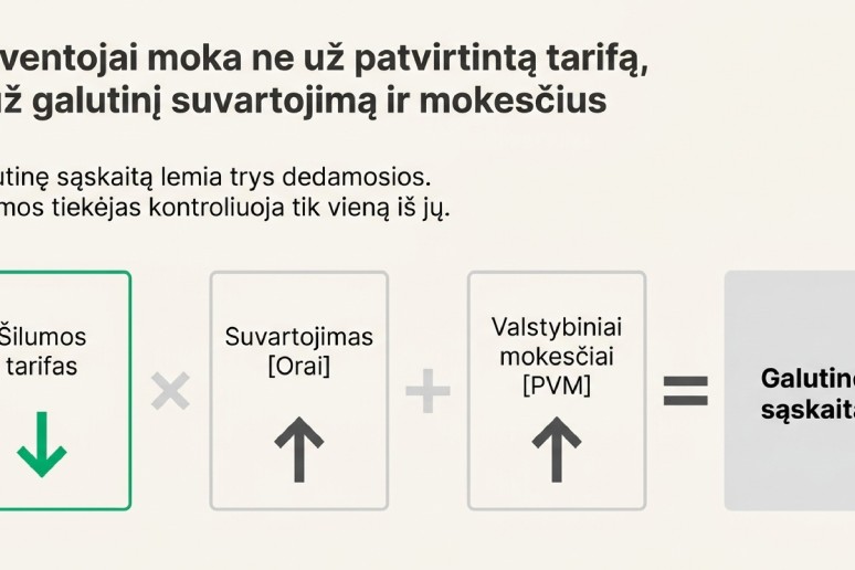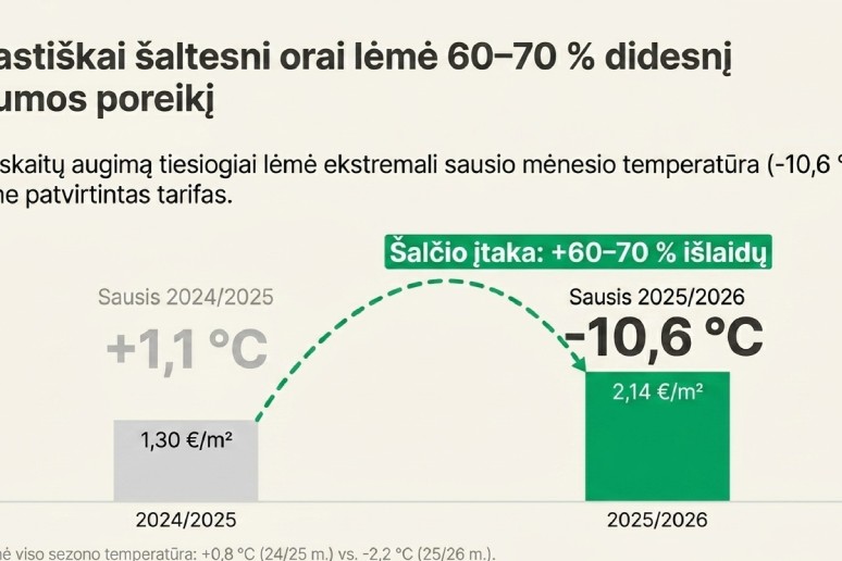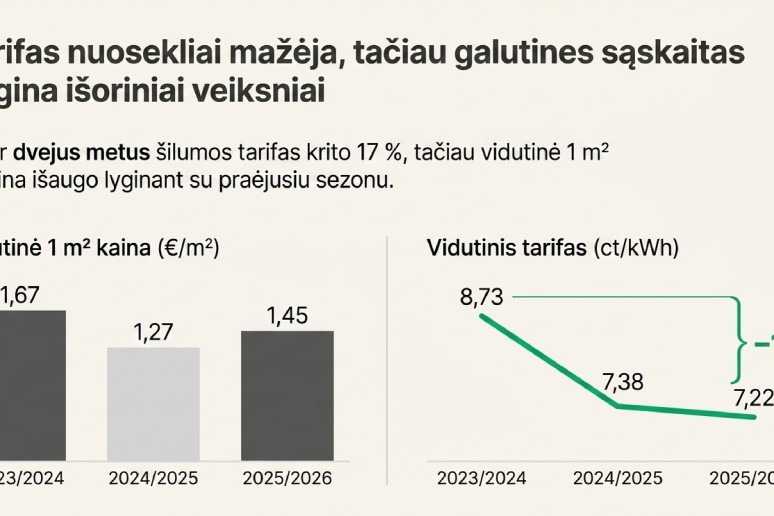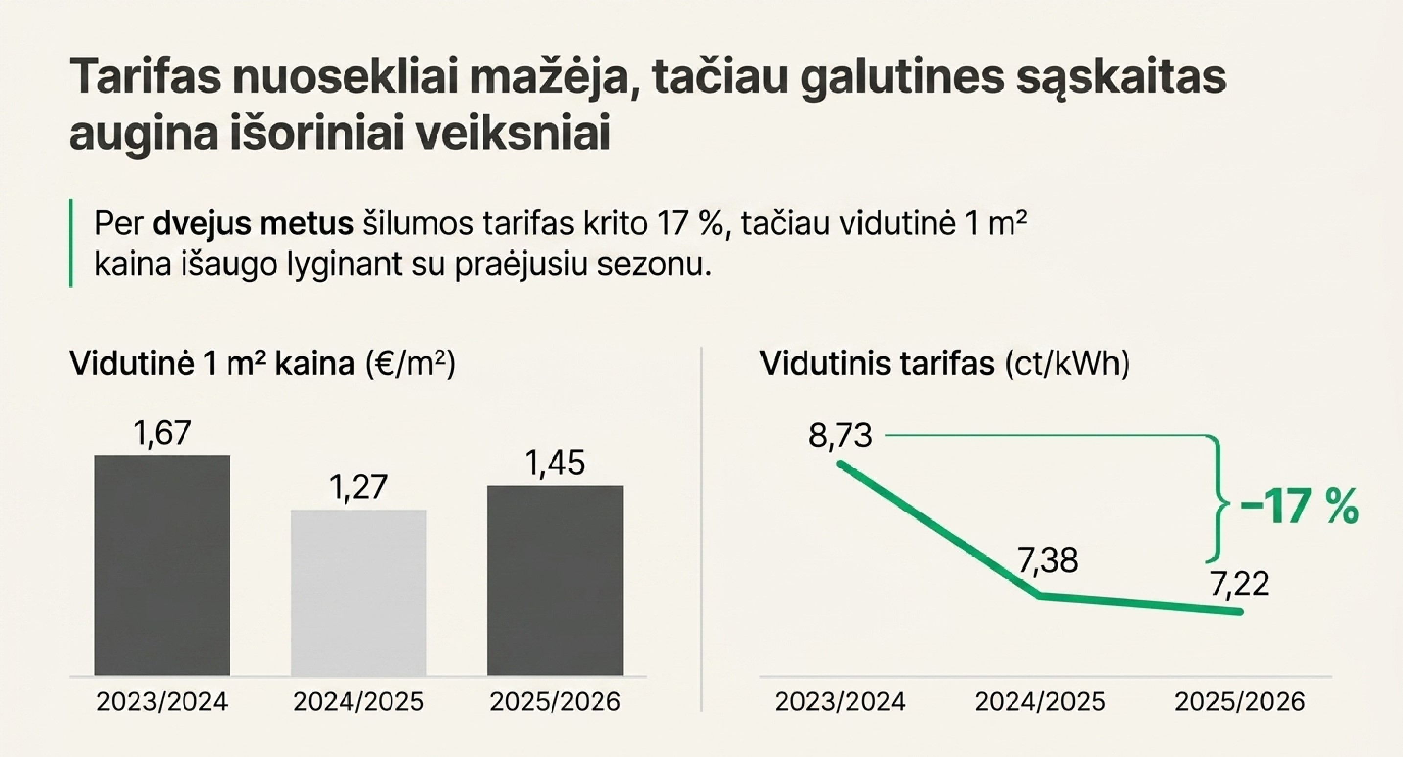2025/2026 šildymo sezonas parodė aiškią tendenciją: net ir esant stabiliai mažėjančiam bei vienam mažiausių Lietuvoje tarifui, galutinės sąskaitos dydį lemia ne tarifas, o orai, šilumos energijos suvartojimas ir mokesčių pokyčiai.