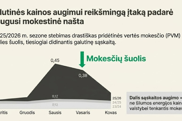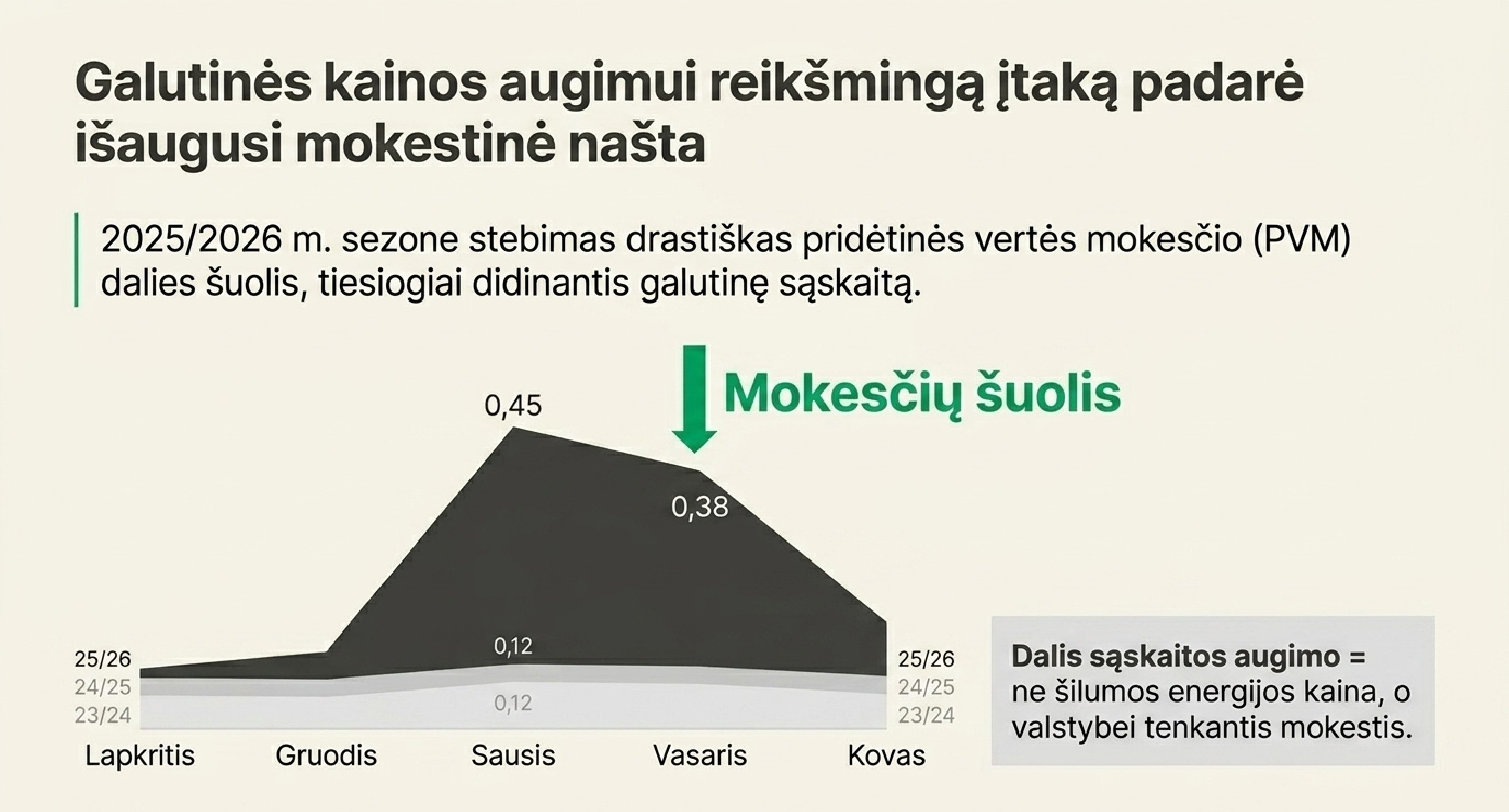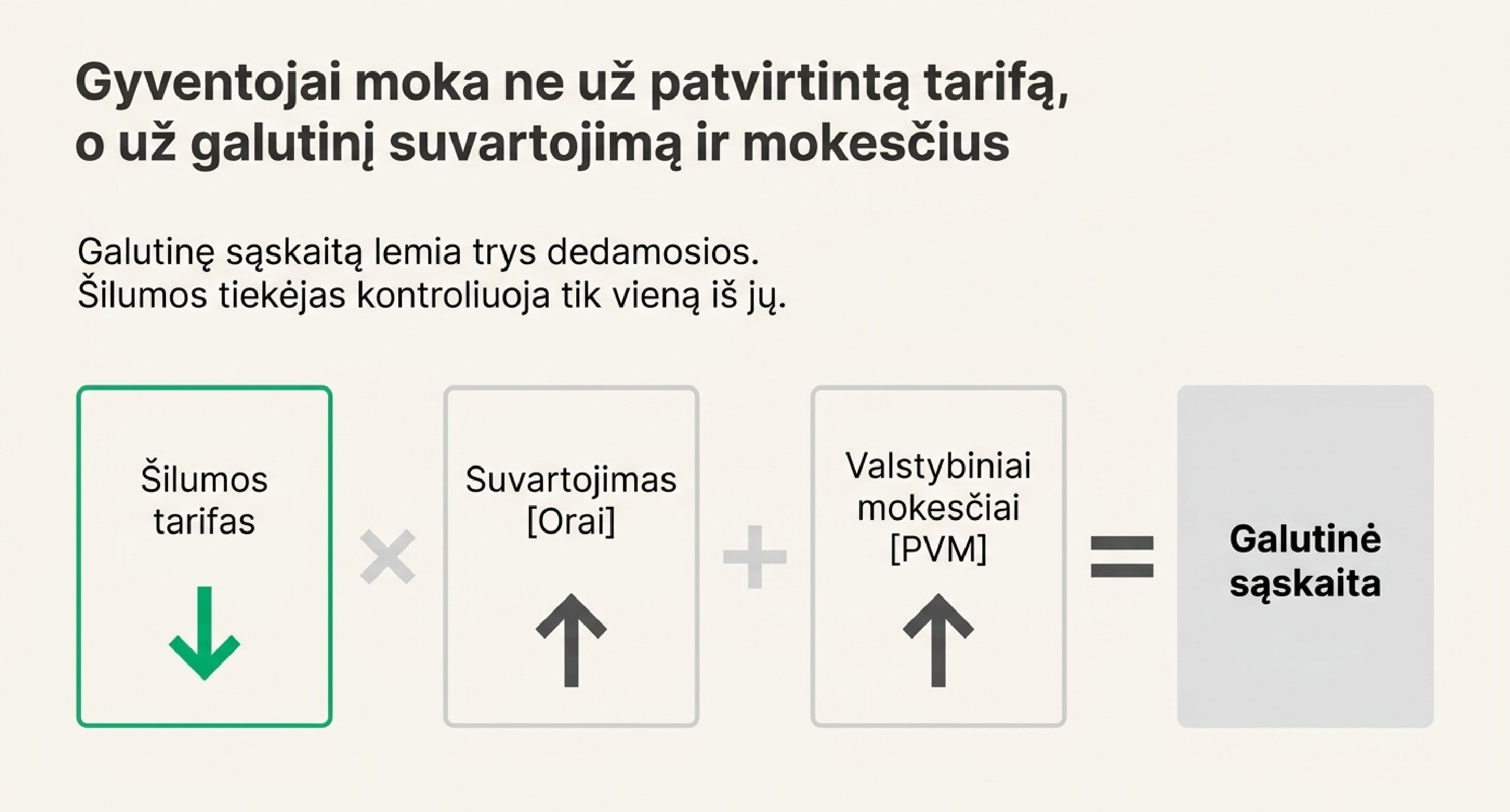 Tai rodo, kad dalis galutinės sąskaitos augimo susijusi ne su šilumos kaina, o su mokesčių pokyčiais.