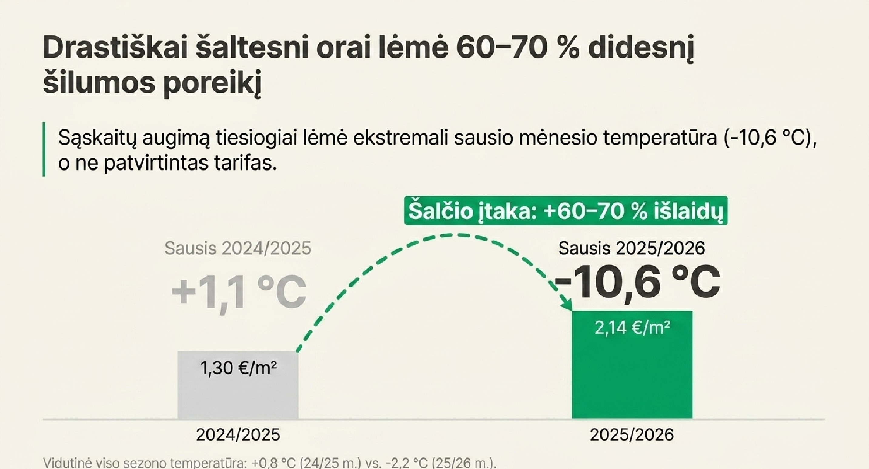Dėl to šilumos poreikis vidutiniškai išaugo apie 20 proc., o sąskaitos kai kuriais atvejais padidėjo apie 70–80 proc., nepaisant mažesnio tarifo.
