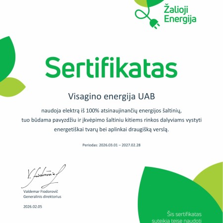 UAB „Visagino energija“ suteiktas Žaliosios energijos sertifikatas patvirtina, kad visa bendrovės veikloje naudojama elektros energija yra 100 % pagaminta iš atsinaujinančių energijos šaltinių.